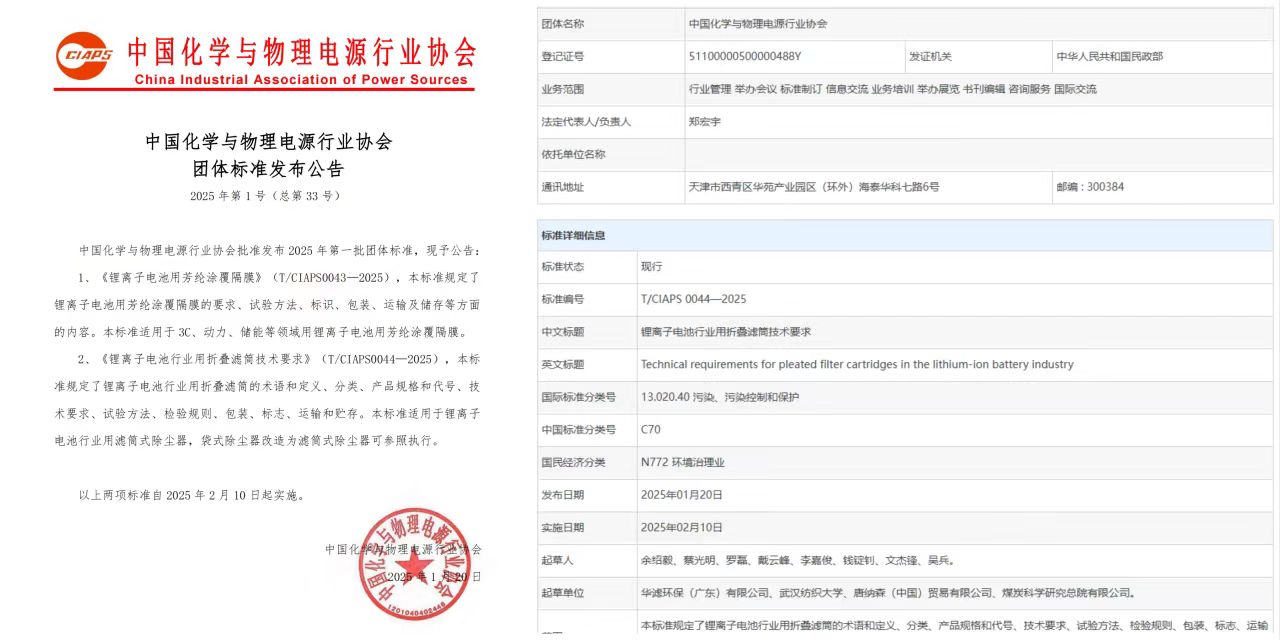 公司主导编制了《锂离子电池行业用折叠滤筒技术要求》团体标准,实现了多项技术在创新突破与行业标准化方面的双重成果。