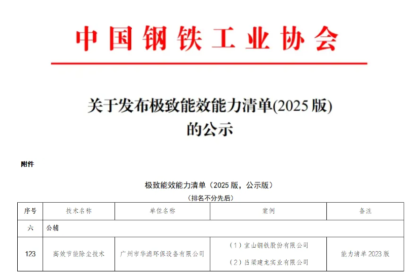 近日,广州市j9九游会老哥俱乐部交流区环保设备有限公司凭借自主研发的高效节能除尘技术,顺利通过中国钢铁工业协会与国家节能中心组织的行业专家严格评审与会审,成功入选“极致能效能力清单(2025版)”。此次入选标志着j9九游会老哥俱乐部交流区环保的技术实力与节能成效获得了国家行业协会与权威机构的双重认可,代表了当前行业节能减排的先进水平。